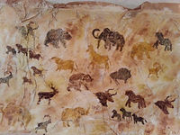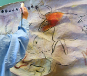 et voilà notre peinture rupestre qui prend forme avec ses mains négatives, ses chevaux au galop et ses têtes d'aurochs aux grandes cornes...